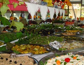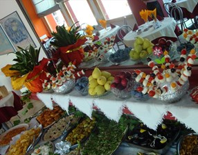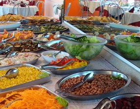 Vous aurez à votre disposition un riche buffet de hors-d'œuvre, sandwichs, pizza, croquettes, salades, légumes frais crus ou cuits: grillés, à la vapeur ou frites.